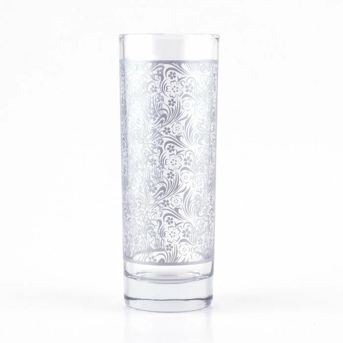 Serve up your cocktails in style with this beautiful floral patterned Collins glass. This high quality glass features a faux etch (scratch resistant) silver imprint of an elegant floral design that wraps around the glass. This custom designed glass is definitely one that will stand out when choosing the perfect craft cocktail inspired glassware to serve your libations in.