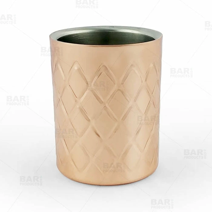 This stunningly beautiful and versatile double wall copper plated tumbler can be used for everything from cocktails and hot beverages. The durable double wall insulated design keeps your drink at the perfect temperature for longer periods of time, versus other standard drinkware. This BarConic® 10 ounce tumbler has a stunning copper finish and features an embossed diamond cut pattern. Add a stylishly vintage look to your drinkware collection today. Measures 4″ tall x 3″ in diameter.