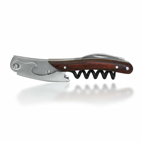 The Napoliโข thin rosewood handle is comfortable to the grip and looks great against the tools. Like the other wine openers in this series, the spiral is Teflon coated. It’s smaller frame makes it a convenient carry in an apron or pants pocket.