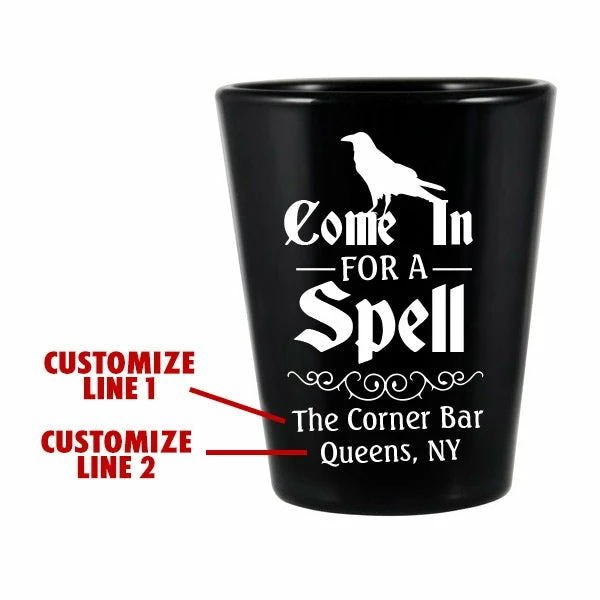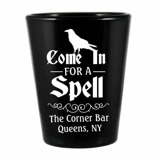 The “Come in for a Spell” themed template makes a perfect addition to your epic Halloween Party. Customize the bottom two lines with any text you would like from the name of your bash to the name of your bar. Custom shot glasses make excellent party favors or souvenir items for your guests to take home. Our team of expert designers will take the information you provide and layout it out on this fun template design. You can even select from a variety of ink colors.