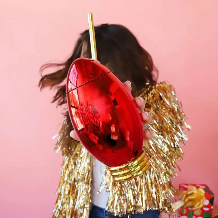 Red Shiny & Bright Holiday Light Cup with lid and straw. This fun 24 oz cup is ready to take on any holiday party or winter event. Simply twist the lid off and pour whatever your favorite holiday beverage is in and get to drinking! Perfectly designed to give a nod to your favorite nostalgic Christmas light. The cap screws on tight and features a 0.25″ diameter straw hole on the top with spill-proof stopper. The plastic straw measures 8 โ ” length. The cup as well as the straw is reusable. Measures 8โ H x 4โ W.