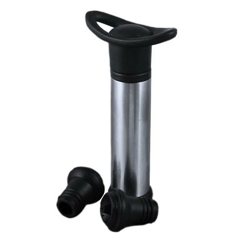Adding a modern barware appeal to any bartending or wine tool collection, this stainless steel and black Wine Pump lets you hang on to opened wine bottles longer. It ships with two wine stoppers so you can get started right away saving money and freshness.